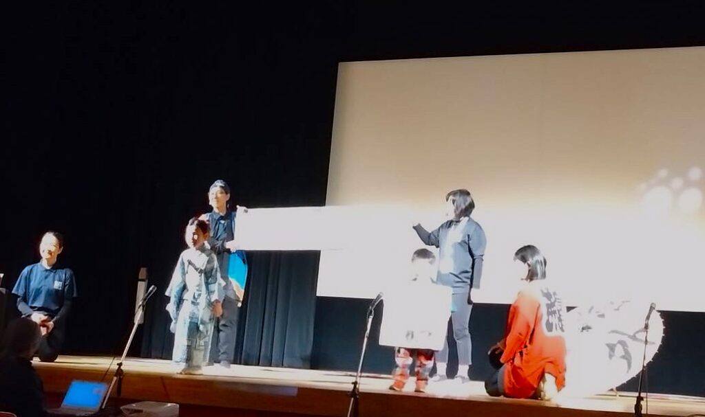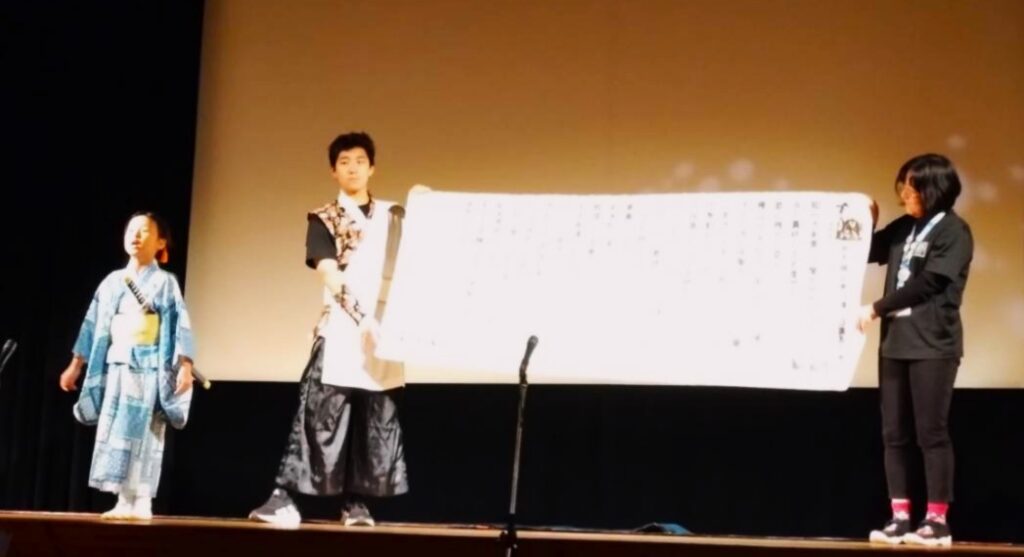 生涯学習センターけやきの舞台で子どもたちが元気いっぱい「外郎売の口上」や「しらざあ言ってきかせやしょう」で始まる弁天小僧菊之助のセリフを披露しました
